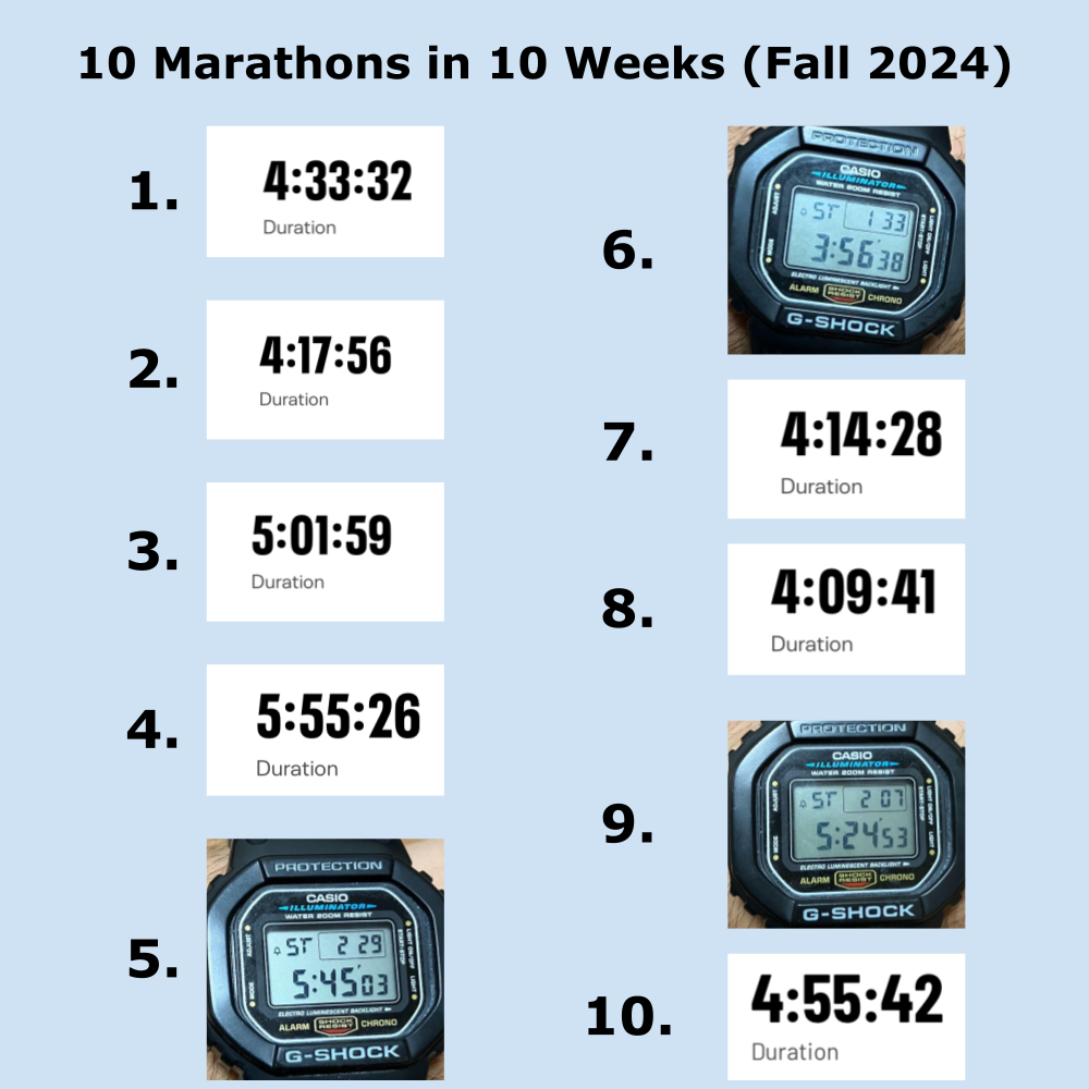 I was able to complete the 10 marathon challenge successfully! Here were my final times: