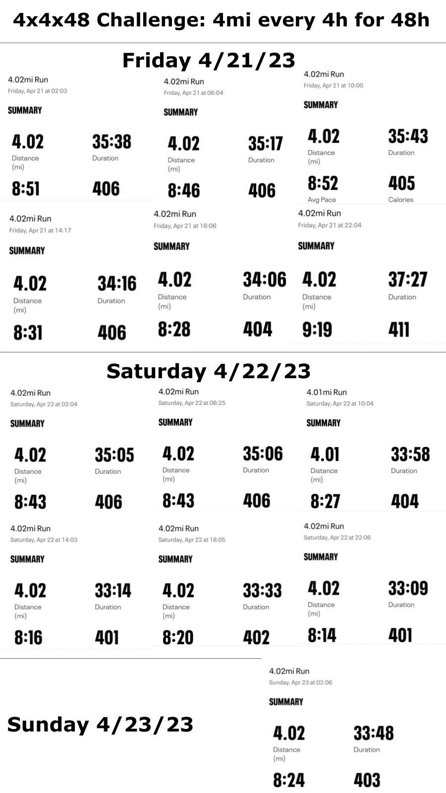 I recently ran 4 miles every 4 hours for 48 hours straight (the “4x4x48 challenge”), totaling over two marathons in two days.