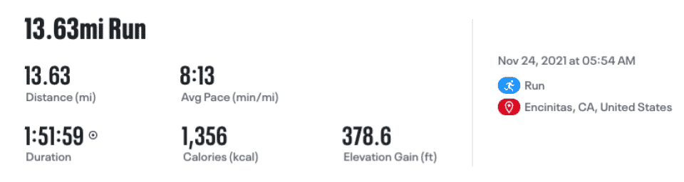 On November 24, 2021 (the day before Thanksgiving), I woke up early and went on a long run to burn off the calories that I was certainly going to gain back the next day. At the time, a long run was 7 miles (3.5 miles out and back). When I got to the turn-around point, I still felt great, and I decided to keep pushing and run 10 miles (5 miles out and back). I didn’t check my watch in time, and it turns out that I accidentally ran 6 miles, which would have made my total run 12 miles. I decided that, at this point, I might as well run enough to exceed a full 13.1 mile half-marathon.
