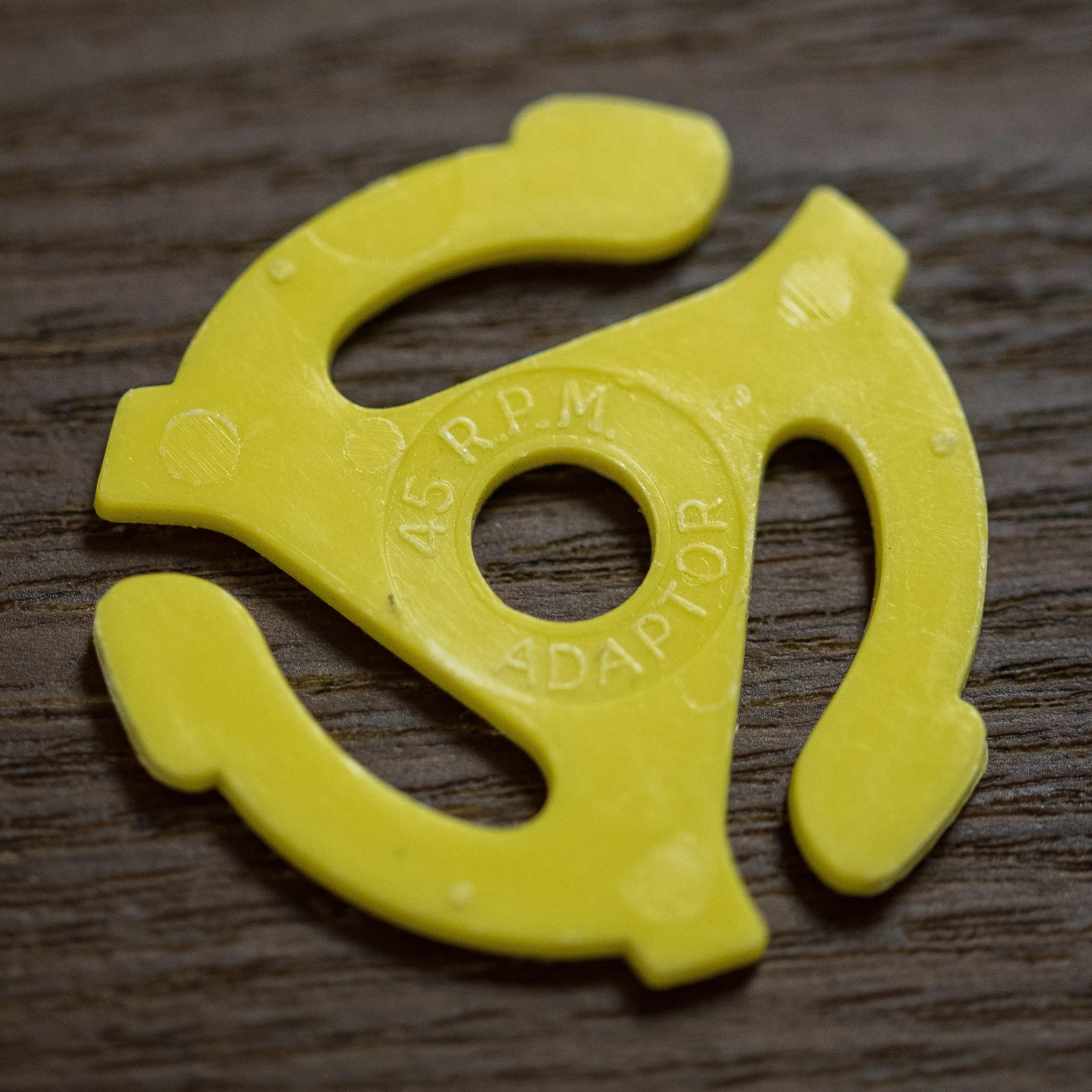 The box set is pretty heavy, so I know this isn’t any old copy of The Joker. I open the box set to find three LPs and a booklet explaining the history of The Joker, inside of which was a “tiny record” that had on it only two songs per side. I had never seen one of these before, so I ask Mark what it is. He told me it’s a 7-inch 45rpm vinyl, which was used for single releases. He pulls out a little yellow adapter that you’d use to play these 7-inch vinyls on your standard record players, since the hole in the middle is too big otherwise.