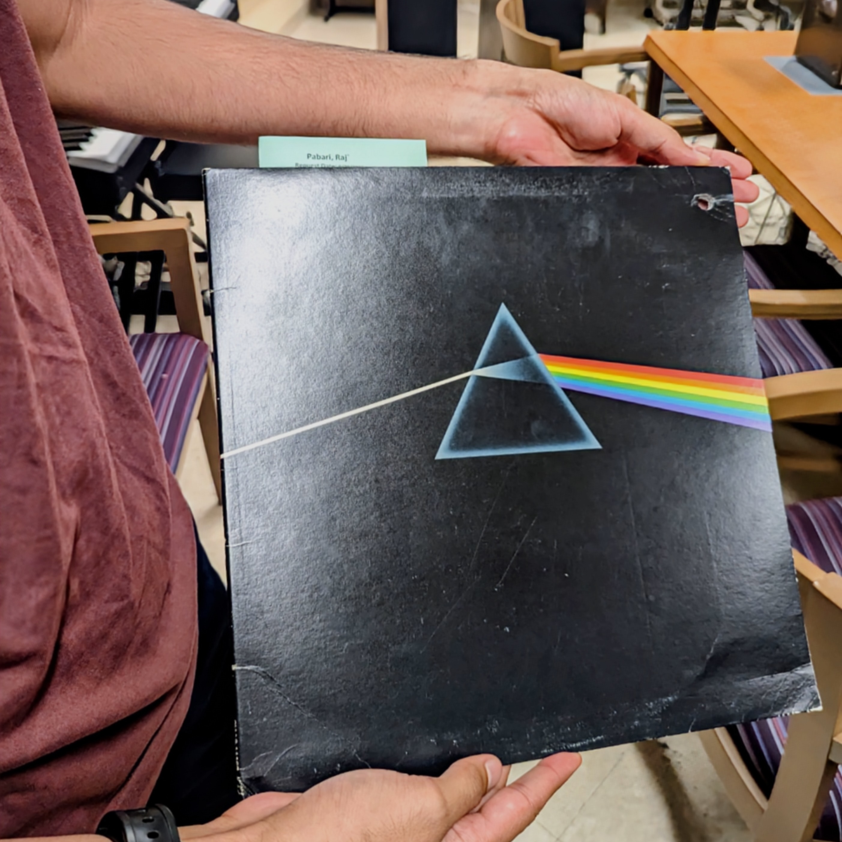 Sometime around here, I was blankly staring across the table and I noticed Mark had a plain CD on his side of the table. On the CD I noticed the most vivid rainbow pattern from the diffraction grating. It genuinely looked exactly like the album jacket (which was also still sitting on the table) and I could resolve every color from red to purple. At this point I started to reflect on the fact that the back cover of the album connects to the front cover and refocuses the light, like in this photo I found online: