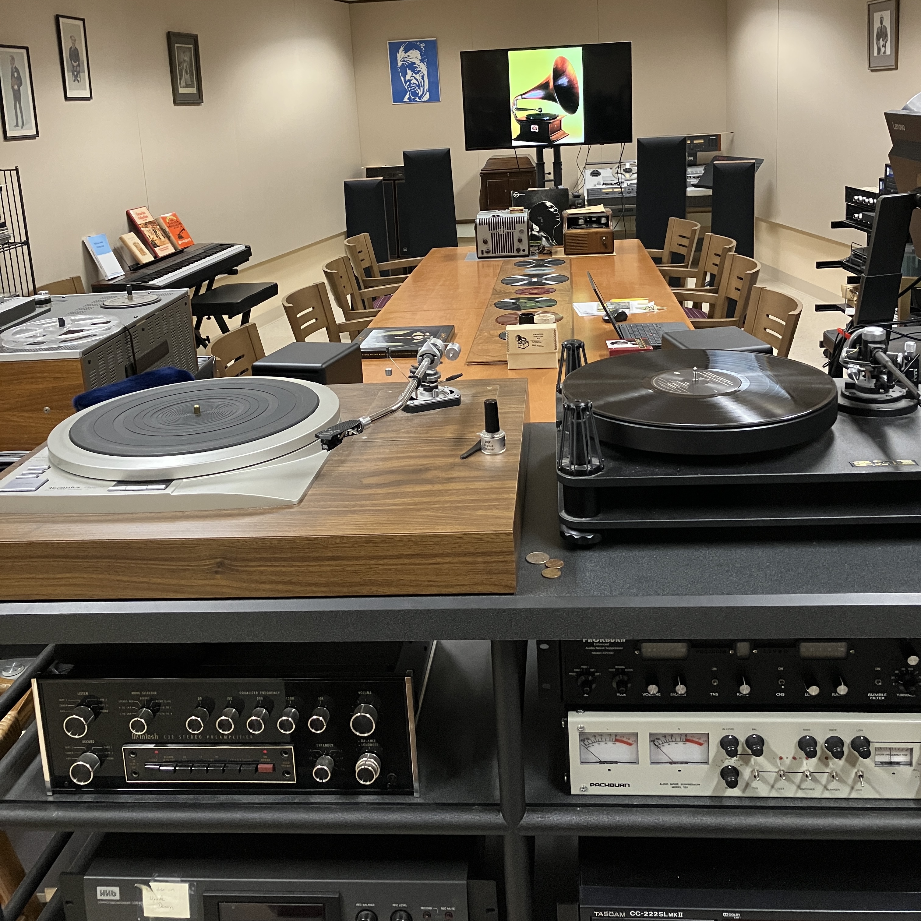 I make my way back to the Gilmore music library and the front desk instructs me to head down into the basement and make a right. Descending into the basement really gives me the dungeon-y feel. I find Mark sitting alone in a big room with sound insulating walls. Prominently featured in this room are a handful of broken records, a plethora of music players, and some huge speakers. I know this is going to be good.